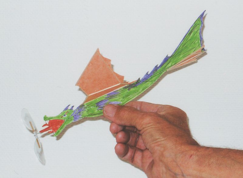 Nu har du skaffat dig ett bra "handtag" på din balsakropp när du ska limma fast den på den färglagda pappersdrakkroppen. Glöm inte att först stryka ditt klädselpapper till vinge och stabbe med ett strykjärn inställt på "bomull". Det är lättast att använda ett limstift för att fästa klädseln på vinge och stabbe och den färglagda papperskroppen. Lägg ett tunt lager lim på balsadelarna och tryck försiktigt fast pappren. Använder du ett spraylim, kom då för all del ihåg att täcka en stor yta med skyddspapper. Klibbiga golv gör ingen glad... Limma fast den färdiga vingen på kroppen - se till att den sitter rakt. Stabben limmar du sedan fast med en "tilt" = snedställning på 5 mm (se ritningen). Lite propellertipsTill propellerbalk använder du en vanlig tandpetare. Dela den på ca mitten och mät till den så att den passar in i navet som du gör av ett plaströr ifrån en bomulls-topp. Se till att den del av propellerbalken som ska gå in i röret är lite konisk. Limma inte fast propellerbalken i röret utan se till att den får en trög infattning. Det är en stor fördel att sedan kunna disponera en ställbar propeller - då kan man ju experimentera med olika prop-vinklar.