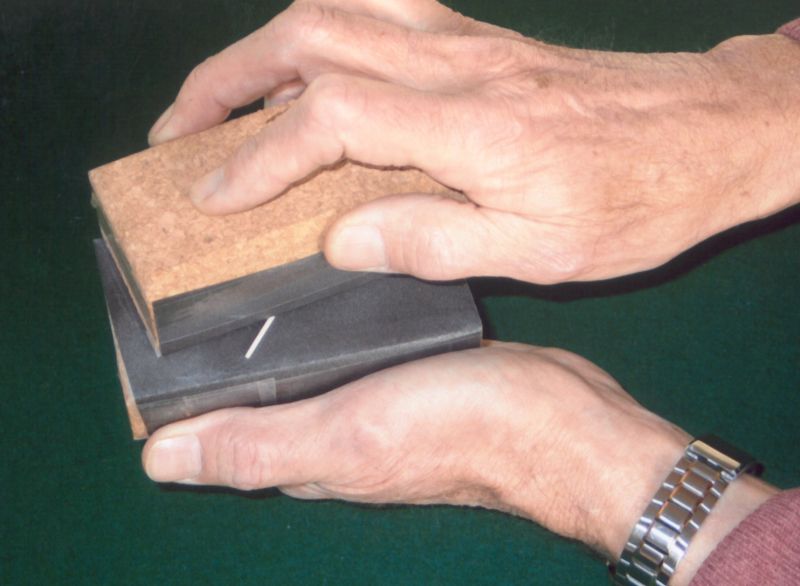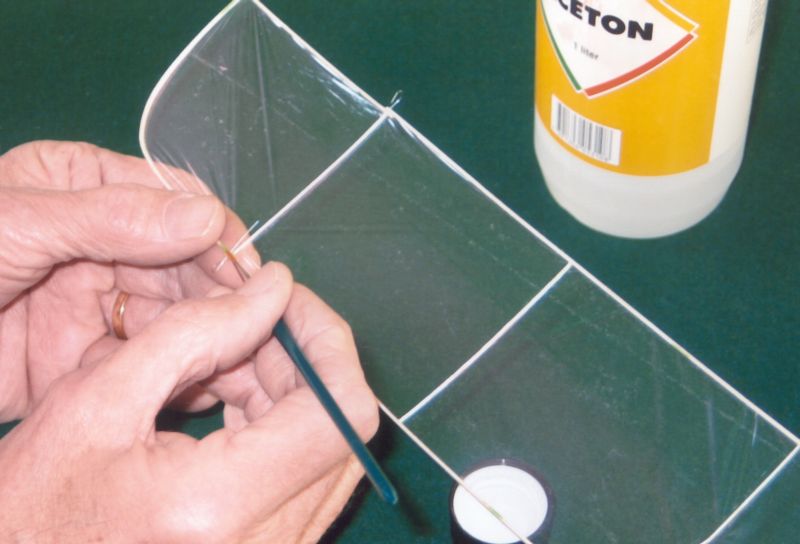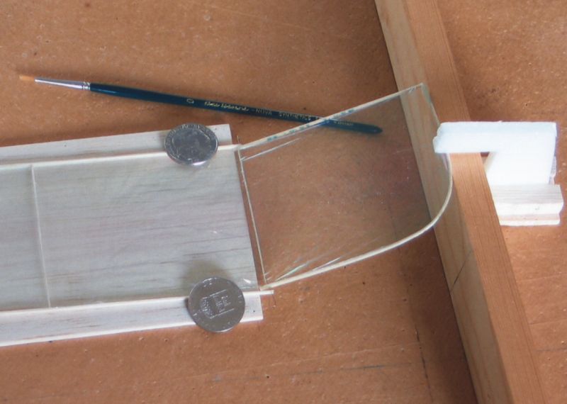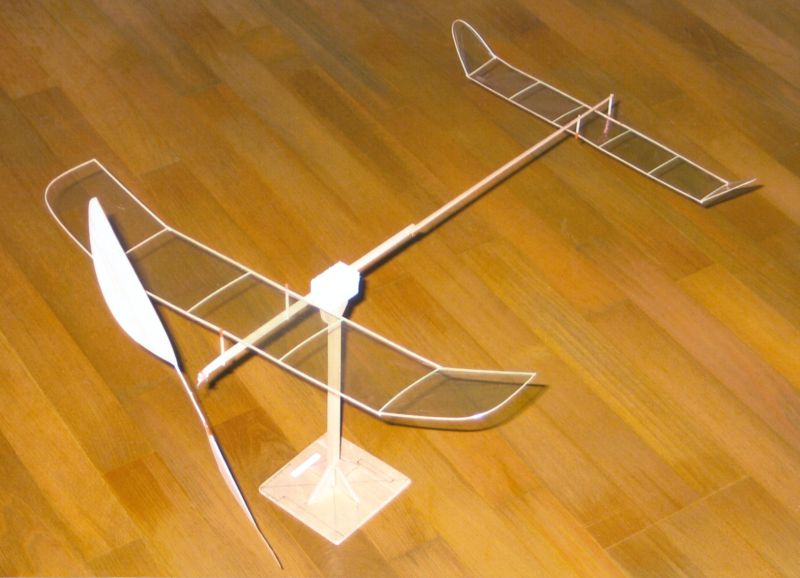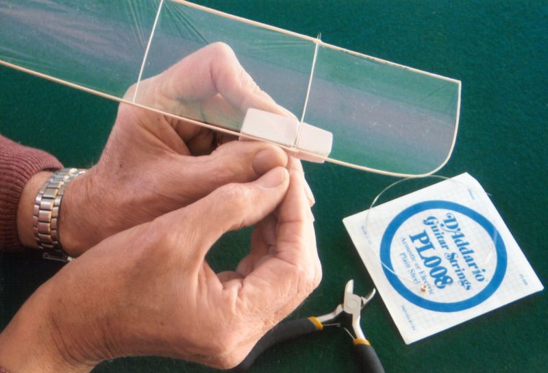 Nu är det dags att lägga vingspets-och stabbspetsvirket i blöt under cirka 30 minuter. Skär till ett par extra bitar för det kan ibland vara lite marigt att få till en bra böj.Som framgår av ritningen byggs vinge och stabbe plana. Kom ihåg att använda ytterst lite lim när du ska fästa vingöron och stabilisatorspetsar vid mittbalkarna. Tag pyttelite lim på en nålspets. Du behöver mycket mindre lim än du någonsin kan tänka dig! Och du, kom ihåg att lim väger, så var sparsam och använd bara så lite som du behöver, och använd enbart så kallat balsalim (t ex utspätt UHU Hart) till hela ditt bygge förutom där ritningen anger ett annat lim. Till klädsel av modellen bör du använda en 0,4 my (tusendels mm) tjock mylarfilm, sk OS-film men det går också bra med den mer vanliga filmen på 0,9 my. Den tunnare väger mindre medan den tjockare är lite enklare att arbeta med. Tips om hur man klär med mylarfilm finner du bland annat i artiklarna som handlar om Lättflygar'n och Hangflygar'n. Och så spetsar vi till det!I en musikhandel införskaffar du dig en gitarrsträng som är 0.18 - 0.20 mm i tjocklek. Av denna sträng ska du nu tillverka dina "gångjärnsnålar" som du ska sticka in vid respektive triangelmarkering på vinge och stabbe. Klipp till en bit sträng som är ca 20 mm lång och gör en liten böj i ena änden. Den blir då lite lättare att handskas med. Som framgår av bilden så har jag tillverkat ett litet mothåll av en frigolitbit som jag skurit ut en skåra i där själva sprygeln får plats. Detta mothåll har varit till stor hjälp för mig -gubben börjar ju bli lite gammal... Här handlar det inte om extraknäck!Utan nu ska vi åstadkomma ving- respektive stabbknäckar och inför detta måste vi först lösa upp limmet i knäckarna med lite aceton. Följ beskrivningen, tag god tid på dig och bruka inte våld. Det kan ta några minuter att lösa upp limmet. Lägg på mer aceton om det dunstar innan limfogen lossnat. Glöm sedan inte bort att palla upp vingens och stabbens mittbitar med en bit 3 mm flak - se bild. Det sticker ju ut några små flikar trä när du böjer upp spetsarna. Ett annat tips är att du t ex kan tillverka runda propellerbalkar ganska enkelt genom att "rullslipa" en 1,5 x 1,5 mm balsalist mellan två slipklossar -se bild. Och, genom att luta något på en av klossarna kan du åstadkomma ett koniskt resultat. VikterNu återstår bara en fråga om vilka slutvikter på modellens olika färdiga delar som man bör sträva efter. Tja, försök att hålla dig till följande: