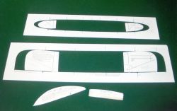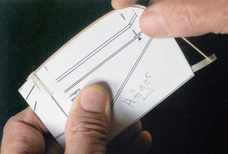 Nu bygger vi negativt!Ja åtminstone bygger vi vinge och stabbe i negativa formar som vi tillverkat av en ca 1 mm tjock kartongbit, se bild. Det som konstnärsbutikerna kallar elfenbenskartong är perfekt. Tag två kopior av ritningen. Klipp ur stabben från ritningen och limma fast den på kartongen. För att få en komplett vingritning att klistra fast på din kartong måste du använda dina bägge kopierade ritningar. Var noggrann när du klistrar upp ritningen kartongbiten. Med en skalpell (Clas Ohlson har en utmärkt - art nr 20-3129) skär du nu ut stabbe respektive vinge i dess ytterkonturer. På köpet får du nu de fyra "böjmallarna" som du behöver för ditt vidare bygge - se bild. Nu undrar du kanske varför vi har valt att bygga detta vis. Saken är den att på tävlingar mäter tävlingsledaren modellerna så att de håller de rätta måtten, och då gäller det att ha byggt sin kärra exakt. Vidare så rekommenderar jag dig att inför en tävling alltid ha två exakt lika modeller med dig. För, kommer du dit med bara en modell så löper du stor risk att modellen antingen fastnar i taket eller förolyckas på annat sätt. Har du en reservmodell brukar förstamodellen klara sig utan missöden. Du har val hört talas om alltings jäklighet i kvadrat???
