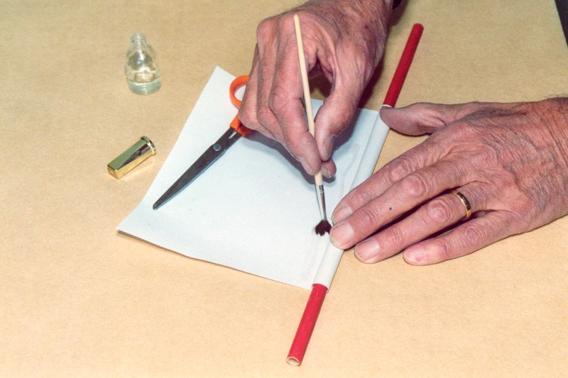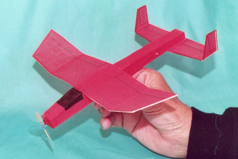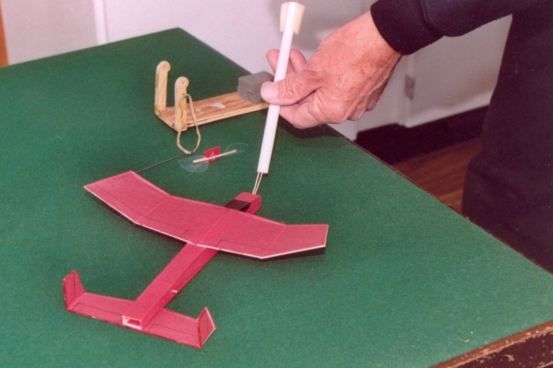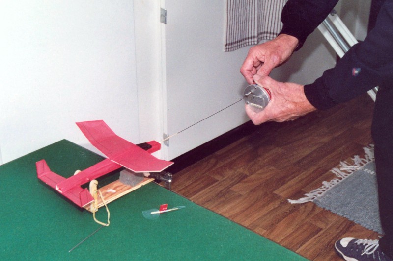 Skaffa dig nu en rundstav eller en rörbit som är ca 8 mm i diameter. Använd ett vanligt A4-papper och rulla på ett par varv på rörstaven, samtidigt som du penslar på lite lim (se bild). För att sprängröret sedan ska kunna bli kvar inuti kroppen medan du vevar upp din motor och inte ska kunna "valsa runt" så tar du och limmar fast ett par skumplastkilar på rörets front. Se bild. Du hakar först på din gummimotor på kroppens gummipinne. Sedan tar du och hakar på pianotråden på motorn med hjälp av trådens krok. Trä nu på sprängröret på pianotråden och för in röret i kroppen. Haka fast din gummimotorvev i pianotrådens ögleända och börja veva upp din motor. När du så är "färdigvevad" drar du först ut röret över din pianotråd, hakar av motorn från tråden och hakar på din propeller. På bilderna skymtar du ett litet hjälpmedel som jag använder mig av för att hålla fast modellen när jag är ensam om att veva upp min modell. Konstruktionen talar för sig själv, men för att jag ska kunna göra mig nytta av den måste jag använda ett litet två millimeters aluminiumrör i stället för en tandpetare som gummimotorpinne. Genom ställets hållare och aluminiumröret trär jag en 0,8 mm pianotrådbit för att kunna hålla fast min modell. Gör det enkelt för digNär du trimmar din kärra, gör då bara en åtgärd åt gången. Du kan i stort sett följa råden som finns i artikeln "Trimtips", även om tipsen är skrivna för en annan typ av modell. Kroppsflygar'n kan - rätt trimmad - flyga i ditt vardagsrum, men den gör sig kanske ännu bättre i en lite större lokal. (Vi har sammanställt en liten sats till Kroppsflygar'n med de bitar som är svåra att få tag på, bland annat gummi till motorn, papper att klä med och material till propelleraxeln. Ring till Kalle Westerblad, 040-47 20 20.)
