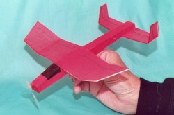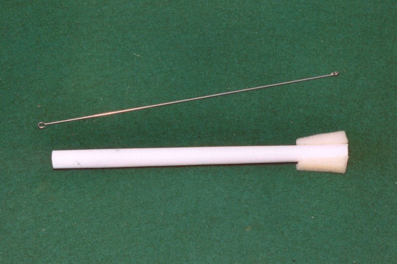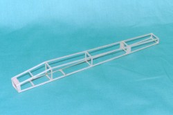 Vinge och stabbeVinge och stabbe kommer inte att vålla dig några bekymmer, bara följ ritningen. Lägg märke till att den vänstra "mittensprygeln" på vingen är snett placerad - Detta innebär att du får en inbyggd skevhet på din vinge, sk. Wash In. När du sedan ska klä din modell kom då ihåg att inte sträcka pappret. Lägg det nystrukna pappret på bordet och tryck fast de limbestrukna ytorna mot pappret. Låt torka och renskär. Om du sträcker pappret riskerar du att åstadkomma skevhet som aldrig går att få rätt på. Nu gör vi oss ett sprängrör!Saken är ju den att i en kroppsmodell sitter gummimotom inuti kroppen. Skulle då motorn sprängas medan man vevar upp den innebär det oftast katastrofala följder och du får återgå till din byggbräda. Det är enkelt att undvika en sådan situation genom att använda detta hjälpmedel som egentligen består av två delar : Ett - i detta fall - pappersrör och en bit en-millimeters pianotråd. Pappersröret skall vara lite längre är avståndet mellan "gummipinnen" och frontspantet. Pianotråden skall vara cirka två centimeter längre än pappersröret. Den ska ha en ögla i den ena änden och en krok i den andra (se bild).