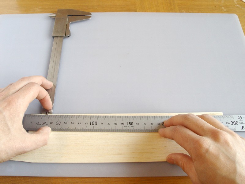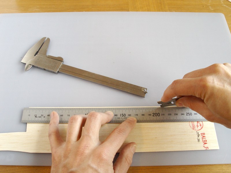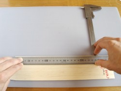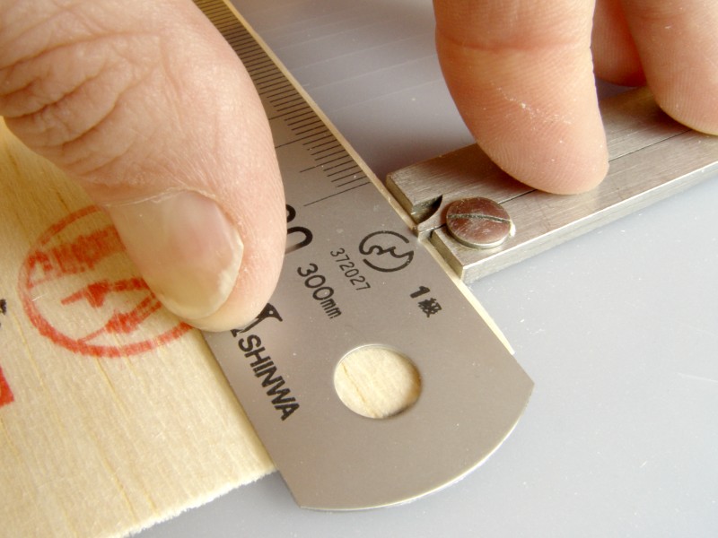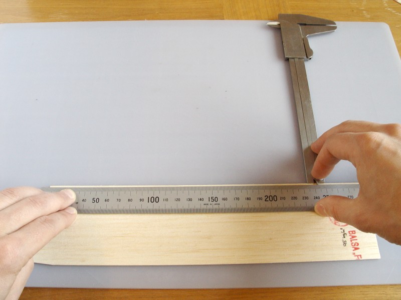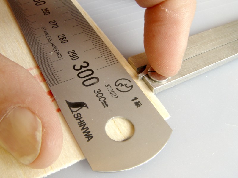 Mät in linjalens båda ändar mot balsaflaket. Se upp så att linjalens motsatta ände