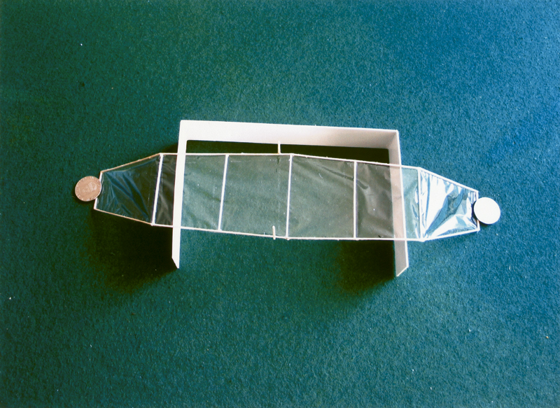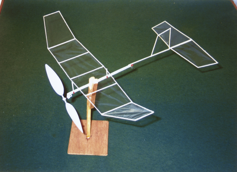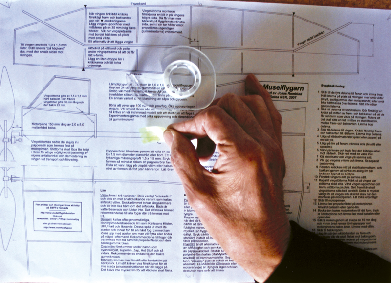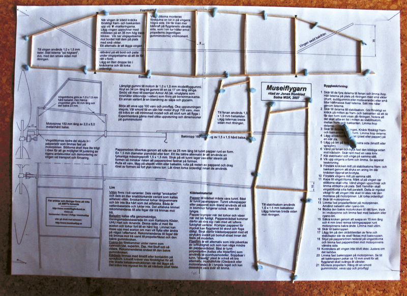 "Inomhusmodeller är ju snygga, men sån't där kan ju bara experter" Så tänker nog många inklusive jag själv. Men är det verkligen så krångligt och svårt att en normalt händig person inte skulle kunna klara av det? Svaret är ett rungande Nej! Hur kan jag veta det? Jo, det är historien om Museiflygar'n och hur några personer som aldrig tidigare byggt en flygplansmodell både byggde och flög den på en eftermiddag... Bakgrunden är att Tekniska muséet kommer under året satsa en del på temat flyg. I samband med det frågade jag och Jonas Romblad om muséets personal skulle vara intresserade av att lära sig lite mer om modellbygge. Tanken var att de själva sedan skulle kunna bygga flygplan med besökarna i Tekniska muséets verkstad och på så vis sprida flygintresset vidare. Idéen blev entusiastiskt mottagen och i början av februari träffade Jonas och jag en skara av muséets pedagoger för en liten kurs i aerodynamik och modellbygge. Vi började dagen med att demonstrera olika typer av inomhusflygplan, bland annat enkla stavmodeller, No-Cal och ornithopter. Stärkta av en stunds lek, gjorde vi tillsammans flera olika glidare av tunt skuren frigolit. Efter att ha prövat några utprövade typer (se artikeln om Skumflygarna) experimenterade sedan deltagarna med egna konstruktioner. Utifrån deras egna försök kunde vi diskutera vad som krävs för att ett flygplan ska hålla sig i luften. Betydelsen av lyftkraft, tyngdpunkt, balans och roderfuntioner blev lättare att förstå tack vare de enkla glidarna. Sedan var det då dags för Museiflygar'n... Jag som själv mest bygger stadiga skalamaskiner blir lätt tveksam när jag ser de tunna balsalisterna och ser framför mig en lång rad knäckta pinnar och en vek, skev slutprodukt som flyger något sämre än en papperssvala... Glädjande nog, fanns överhuvudtaget inte den reaktionen hos deltagarna! Efter en kort genomgång om hur man kan limma och skära listerna, satte de igång. Genomgående användes alifatiskt trälim, inte balsalim med särskilda hemliga ingredienser som helium eller mikroballonger. Inte heller använde vi extremt lätt trä utan listerna skars ur ganska ordinärt "hobbyaffärs trä". För att hålla listerna på plats under bygget använde några mynt medan andra använde små bitar häftmassa. Båda metoderna fungerade bra. Vi hade valt att klä vingarna med tunn polyesterfilm fäst med spraylim. Eftersom spryglarna på modellen inte är välvda utan bara raka lister gick påklädandet smärtfritt och enkelt. Överskottsmaterialet skars bort med ett nytt rakblad. Även detta fungerade bra för de som prövade. Museiflygar´n har tre knäckar i vingens fram- och bakkant och det är nog något som kan göra även den ganska rutinerade byggaren lite smått oroad. Detta visade sig dock inte vara något större problem. Visst knäcktes några lister mer än det var tänkt men mycket färre än jag hade trott. Tillräckligt fibrigt trä håller ihop riktigt bra.