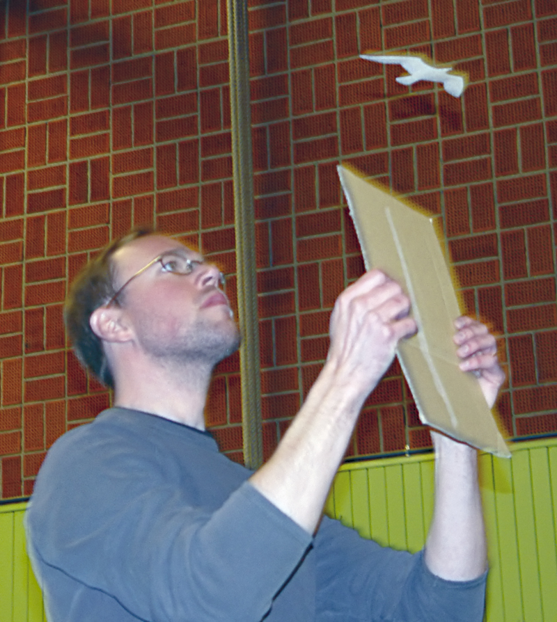 Först ska du vika upp dina bägge höjdroder. Enklast gör du detta genom att På sju minuter kan du snabbt och enkelt "bygga" dig din egen skumflygare. lägga den utskurna modellen kant-i-kant på ritningen. Nu använder du dig av de hjälplinjer som är utritade och som visar var höjdroderna ska vikas uppåt. Lägg på en linjal längs med linjerna och vik upp dina roder cirka två millimeter. (Se bild.) Fäst sedan fast din nosvikt som kan bestå av en bit tunnt lödtenn, modell-lera eller häftmassa. Lödtennet tejpar du fast med en liten bit maskeringstape. Avpassa nu höjdroder med nosvikt så att du får en modell som flyger rakt fram och samtidigt så långsamt som möjligt utan att flyga guppigt det vill säga "stalla". Slutligen gör du nu det dykprov som finns beskrivet på ritningen så att du kan konstatera att du funnit din modells rätta stabilitet. Tänk på att alltid endast göra en trimåtgärd åt gången! Att flyga med hjälp av sina händer eller en pappskiva?Det hela bygger på att när man går framåt så kan åstadkomma ett "hang" eller enkelt uttryckt en luftkudde - genom att använda sig av sina händer eller en pappskiva i ungefärlig storlek A 4. Placera dina händer i ögonhöjd framför ditt ansikte med ett mellanrum av 5-10 cm mellan dina händer. Går du nu framåt åstadkommer du det "hang" som modellen flyger på. Nu gäller det för dig att finna den rätta vinkeln på dina händer och att känna av den rätta gånghastigheten. Jodå, det tar en stund att finna det rätta "knixet".