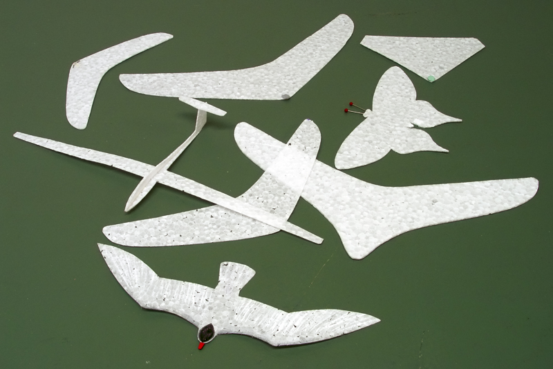 7 Minuter!Jag har roat mig med att kolla hur lång tid det tar för mig att få till en skumflygare, och faktiskt, det tar inte mera är sju minuter från det att jag startat med att klistra upp min ritningskopia på en begagnad tårtkartong och skurit ut min mall ur denna. Denna mall använder jag sedan för att för att snabbt skära ut min modell ur frigolitskivan varpå jag satte igång med min trimning av modellen. Allt på sju (7) minuter! Men, då måste man ha lite tur och vana med trimningen för den kan ibland ta lång tid när det hela strular och då gäller det att ha stort tålamod. Strålande tider! Härliga tider!Ja det är det faktiskt för nu kan alla släppa loss sin inneboende kreativitet! Nu kan du på kort tid skapa dina egna skumflygare. Du kan nu ge dig hän i science-fiction-världen och skapa ditt eget tefat eller rymdflygare. Eller så kan du ge dig ut i naturen och "bygga dig" en egen färgrik fjäril - jo, det går att måla på frigolit men testa först och måla synnerligen tunnt! Kanske är en fladdermus ett projekt som tilltalar dig eller så kan du ju till exempel skapa en ståtlig rovfågel eller ett annat fantasiprojekt. The sky is the limit! Sätt du igång och jag kan lova dig många trevliga flygupplevelser. Leve kreativiteten! (Har du svårt att skära till den tunna frigoliten? Ring till Kalle Westerblad, 040-47 20 20.)