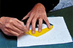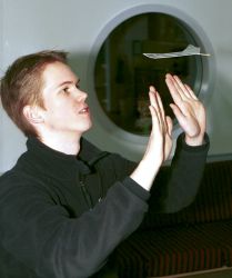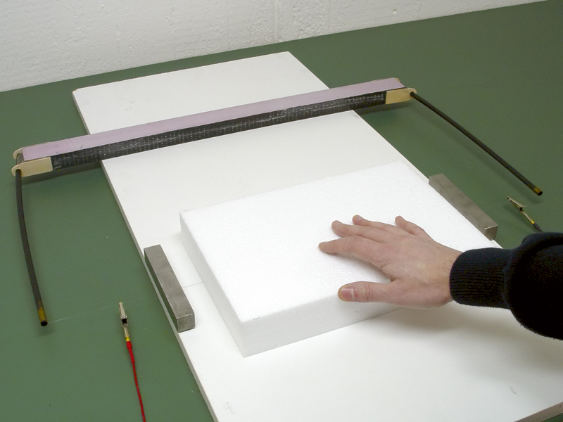 Starta modellen så högt över ditt huvud som du kan. Då hinner modellen stabilisera sin flygning innan den behöver din "hanghjälp". Nu styr du din skumflygare med dina händer. För du ihop dem motsvarar detta höjdroder. Särar du på dem motsvarar detta dykroder. För du bägge händerna mot vänster rollar/svänger modellen mot höger och vice versa (Se bild.) Du kan även flyga din modell med hjälp av en pappskiva och då styr du din modell genom att vinkla skivan åt olika håll (se bild). Tunn frigolitVar får man tag på det?? Några av oss har genom åren skaffat sig en frigolitvärmesåg så för oss är det inte några problem. Det gäller bara att använda precis så mycket värme som krävs för att under en minut skära till en cirka 1mm skiva i A4 storlek. Ett tips: Använd en så tunn tråd som möjligt vi har till och med testat den tunnaste gitarrsträngen som fanns i affären. Kika på bilderna så ser du hur Jonas gått tillväga. Och, kom ihåg att alltid använda den lättaste frigoliten. För dig som inte har någon möjlighet att själv åstadkomma några frigolitplattor kan jag meddela att jag kan leverera måttliga till självkostnadspris.