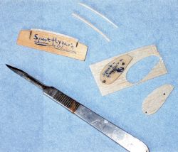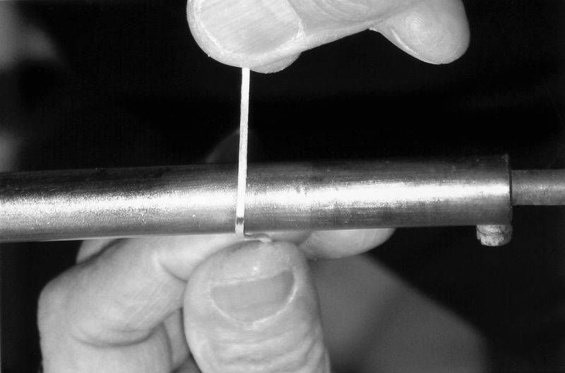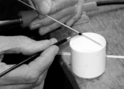 En god nyhet: Man kan lätt åstadkomma dessa "böjar" med hjälp av lite vatten och en lödkolv. Men, först så ska du skära till några stycken framkantlister. Det är alltid bra att ha några stycken i reserv när man provar en ny byggmetod. Alla lister till Sportflygar'n är böjda mot den grova delen av en varm lödkolv. Blöt listen med ett par droppar vatten. Man behöver inte vänta på att listen ska suga åt sig vattnet. Kolven skall vara så varm att det fräser om vattnet, men inte så varm att träet blir mörkt. Dra så hårt som du vågar i listen, böj runt kolven och håll kvar i 5-10 sekunder. Klart! Listerna blir hoptryckta vid böjen, men detta verkar inte vara någon nackdel. Din lödkolvs grova del bör ha en diameter av 10 -15 mm. Mät ut och markera var på listen din böjning skall börja och sätt igång med att prova dig fram. Du kommer att bli förvånad över hur enkelt det hela är!