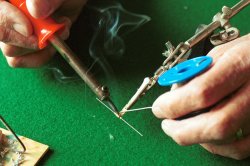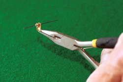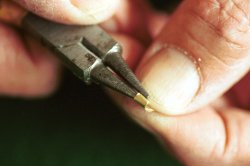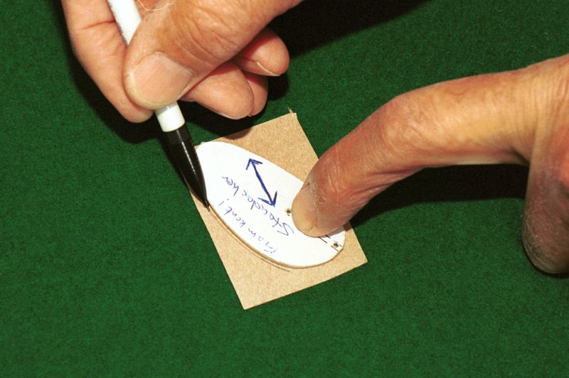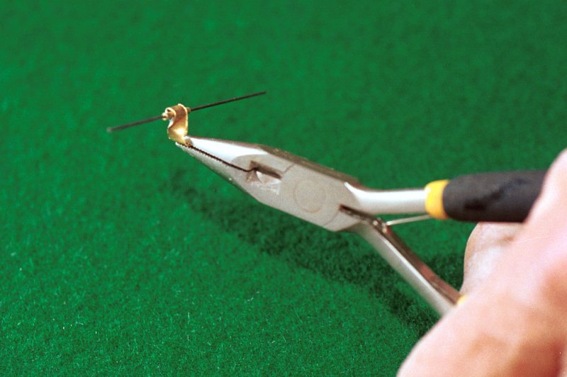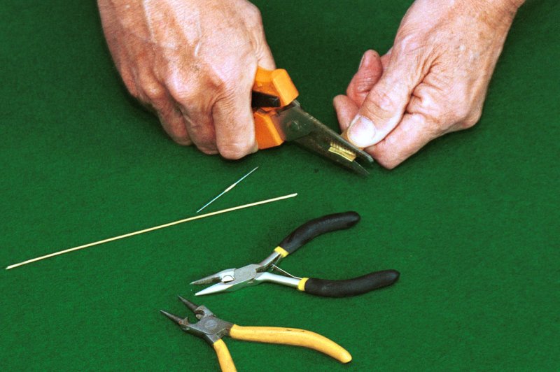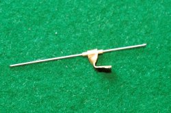 Skär till dina lister. Du kommer att använda 1,5 x 1,5 mm lister till nästan allt utom huvlisten som är 1,5 x 1 mm samt till vingens fram- och bakkant som är 2 x 1,5 mm. Använd lätt trä! Av 1,5 mm plywood gör du nu dina fyra mallar: sprygelmall, propellerbladsmall, huvmall och hjulmall. KroppenGenomfukta din 1,5 x 1 mm list till huven, böj den över din mall och fäst den i de båda ändarna med lite maskeringstejp. Bygg kroppen och var noggrann vid tillpassningen av listbitarna. Använd helst utspätt balsa- eller UHU-lim. Motorpinnen består av en 3 x 2 mm fast balsalist där du limmar dit den bakre motorkroken och propelleraxellagret. Lagret kan du göra som på ritningen, men du kan även göra en annan variant som innebär att du mycket lättare kan trimma in propelleraxelns riktning på din modell. Så här gör jag ett sånt propellerlager: VingenSkär till dina spryglar enligt bilderna. Använd gärna djupmåttet på ett skjutmått för att få rätt höjd på spryglarna (samma metod som för att skära ut listerna).