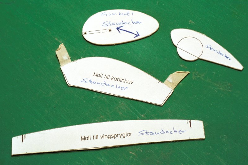 Vad är du en NoCal modell?Som vanligt är ursprunget USA-inspirerat. NoCal kan uttydas till "No Calories", det vill säga att det är en lätt profilmodell som skall väga minst 6,2 gram och ha en spännvidd på högst 40,6 cm. Dessutom skall det vara en modell som är "look-a-like", alltså likna ett existerande flygplan. FörebildenKonstruktören till denna maskin heter Jon Staudacher och han bor i Kawkawlin i Michigan, USA. Sedan 1990 har han på sin fabrik producerat ett dussintal av dessa aerobaticflygplan. Nämnas kan att under 1993 US Nationals var det så många som sju Staudachers som deltog i tävling. 1998 vann en pilot vid namn Rick Martinez IAC Championships i just en Staudacher. På internet kan hitta ytterligare bilder och info som kan fungera som inspiration när du skall dekorera din kärra. Prova att söka på "Staudacher" och "aerobatic" med någon sökmotor. Kom ihåg att i No-Cal så skall det vara "look-a-like" och inte perfekt! I MFN nr. 5 2001 fanns också bilder på förebilden i samband med en RC-test, så det finns gott om bildmaterial. ModellenSom vanligt: Studera ritningen. Den innehåller massor av byggtips och här nedan finner du några ytterligare kommentarer från min sida.