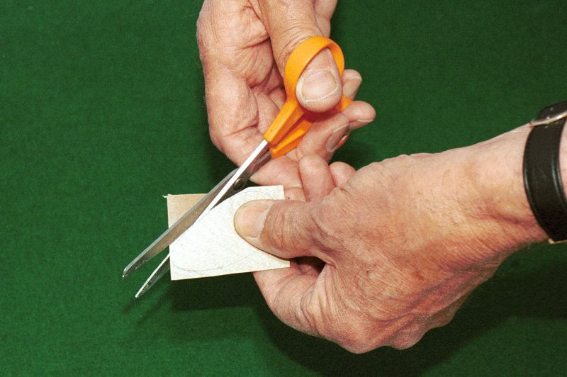 Fram- och bakkantslisterna är 2 mm höga och 1,5 mm breda. Limma in alla spryglarna utom mittsprygeln. Gör en skåra på mitten av vingens fram- och bakkantslist. Nåla ordentligt fast vänster vinge och vik upp höger vinge så att dess vingspets kommer 80 mm över byggbrädan. Lägg lite lim i skårorna och låt torka. Tag nu loss vingen från byggbrädan och limma in mittsprygeln så att den sitter rätt i förhållande till vingens V-form. Nu är det dags att fixa till vänster wash-in genom att böja upp vänster vinges framkant så att dess spets lyfts cirka 6 mm. Fukta vänster vinges framkant ungefär vid första sprygeln räknat från mittsprygeln. Nåla fast och palla under vingspetsen. Låt torka över natten. Ja så återstår det bara för dig att limma ihop din stabbe och sätta igång med dekoration och klädsel. KlädselTill klädsel använder du japanpapper. Preparera alltid först ditt papper genom att stryka det med ett järn inställt på bomull. Detta är nödvändigt för att du senare inte skall få en skev modell. Papper krymper ju. För att fästa klädseln rekommenderar jag ett vanligt limstift. Propellern