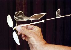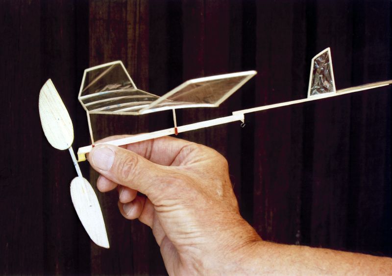 Gör dig först en byggsatsIfrån ett 1,5 mm balsaflak som max väger 15 gram skär du till det antal lister du behöver. Vadå? Köpa färdiga 1,5 x 1,5 mm lister i hobbyaffären? Sorry, men färdigsågade köpta lister är mestadels 3-4 gånger för tunga. Hur du skär ut lister ifrån ett flak kan du läsa i artikeln "ett listigt trick". Nu är det dags att tillverka två mallar. Dessa kan du göra av kraftig kartong eller 1-2 mm plywood. Du behöver en mall för att kunna skära ut dina spryglar och de svängda ytterkantlisterna till vinge, stabbe och fena. Dessutom behöver du en mall för att kunna skära ut dina propellerblad. Själva bygget startarTäck över ritningen med lite Glad Pack. Börja med att bygga fenan. Fortsätt med stabbe och vinge. Fram- och bakkant på vinge och stabbe har ju några knäckar på sig. Dessa knäckar åstadkommer du lätt genom att första mäta ut på listerna var dessa knäckar ska vara och sedan försiktigt "knäcka till dem" med hjälp av din tumnagel. Stick aldrig en knappnål genom dessa tunna lister! De är för tunna för att tåla det. Skär istället till ett antal 1,5 mm. balsabitar som är c:a 30 x 5 mm. Nåla fast dessa bitar längs med t. ex. vingens ytterkanter - lägg dit din färdigknäckta list och fäst den med dina 30 x 5 mm bitar från "insidan". Kom ihåg att använda precis så lite lim som behövs - inga tjocka limklumpar här inte - de vägar multum. Det här gick väl ganska snabbt?Nu tar du och skär ut din motorpinne ur ett 2 mm flak. Tänk på att den ska vara lite spänstig utan att väga för mycket. En motorpinne skuren ur ett 20-24 grams 2 mm flak bör hamna på en vikt på 0,15 - 0,20 gram. Bakkroppspinnen skär du ut av ditt 1,5 mm flak. Försök att finna en lätt bit. Limma fast den på motorpinnen samt kontrollera att du limmat fast den enligt ritningen! Sedan är det dags att limma fast den lilla tvärbiten framtill på motorpinnen. Ditt propellerlager gör du av en bit mässingsrör med en innerdiameter på 0,55 mm. Stick in en bit 0,5 mm pianotråd i röret innan du kapar av röret genom att "rulla" en vass kniv mot röret. Låt nu pianotråden sitta kvar i ditt propellerlagerrör för med dess hjälp kan du lätt konstatera att du limmat fast ditt lager helt rakt. Använd ytterst lite epoxi eller tjockt cyanolim för att limma dit ditt lager. KlädselKlär du din modell med Japanpapper eller kondensatorpapper kan du fästa klädseln med ett limstift. Kom ihåg att använda så lite lim som möjligt. Klär du med 0,9 My film gör du så här: Ha en spetsig lödkolv tills hands och dessutom en burk spraylim - 3M Display Mount eller Super 77 är att föredra. Rulla försiktigt ut filmen - det hjälper ibland att försiktigt blåsa svagt på den och, eller, använda en ytterst mjuk pensel för att släta ut den. Maska nu av ett stort område av ditt golv med hjälp av tidningspapper. Lägg din vinge med ovansidan uppåt på ditt "maskpapper" och spraya vingen på ett avstånd av ca 40 cm. OBS! Bara en lätt dusch längs med vingen. Lägg sedan vingen med limsidan mot filmen med en svagt rullande rörelse så att filmen fäster på alla spryglar och lister. Fortsätt sedan med stabben och fenan. Tänk på att fenan ska kläs på dess vänstra sida. För att skära rent filmen använder du din lödkolv. Kolla då att den är tillräckligt varm - prova på en testbit film. Lödkolven skall smälta filmen ett par mm från spetsen. Fastnar filmen på kolven är den för kall. För nu din lödkolv runt alla ytterkanterna med en lugn rörelse och vips så är du ägare av tre klädda enheter. Nu ska vingen ha sin V-form