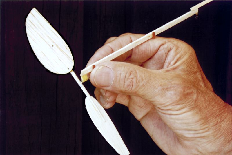Först skaffar du dig två balsabitar som är 22 mm höga. Dessa bitar ska du använda för att palla under med när du ska knäcka upp dina vingöron. På ritningen finner du märken var du - från vingens undersida - ska göra insnitt genom halva fram och bakkantlisten. Knäck upp listerna, sätt en liten limklick av balsalim i själva knäcken och palla upp bägge vingöronen med hjälp av dina pallklotsar. Se till att ditt vänstra vingörons framkant pallas upp två mm högre för att ge detta vingöron lite wash-in. Låt torka. Nästa steg är V-formsknäcken i mitten av vingen. Gör dina insnitt vid vingens mittsprygel, palla upp ena vinghalvan 16 mm och lägg lite lim i knäcken. Låt torka. Limma nu fast vingstöttarna på din vinge. Runda först till dem i nederkant, de ska ju passa trögt in i sina pappersrör. Dessa rör tillverkar du av en bit Japanpapper 10 x 30 mm. Rulla upp pappersbiten ett varv på en 1,5 mm pianotråd. Dränk in pappersbiten med balsalim och fortsätt att rulla upp den på pianotråden. För sedan genast av pappersröret ifrån tråden med hjälp av din tum och pekfingernagel och låt röret torka. Dela sedan ditt rör i två bitar 5 mm långa. När du sedan ska limma fast rören på motorpinnen är det klokt att först trä upp rören på extrapinnar så att du kan syfta och se att du limmat fast dem helt rakt. Använd en av pinnarna för att kunna kolla att fenan sitter rakt. Limma nu fast din stabbe med litet tilt - se ritningen.