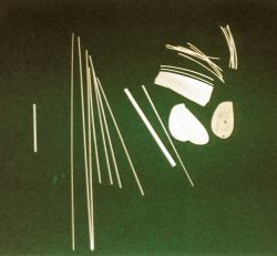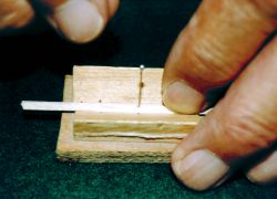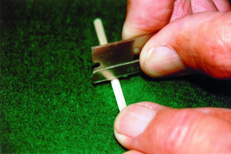 PropellerSkär ut dina propellerblad ur ett extra lätt 1 mm. balsaflak - flakets vikt 8 - 9 gram. Bladen ska vara helt plana. Till propellerbalk använder du en köpt 2 mm list. Vad nu då? rekommenderar jag dig att köpa en list?? Jo, det gör jag för att här behöver vi en litet stadigare kvalitet. Det är dessutom viktigt att listens tvärsnitt är helt kvadratiskt, något som är svårt att göra själv - om man inte är riktigt noga förståss. För att du enkelt ska kunna limma fast dina propellerblad i 45 graders vinkel på din propellerbalk måste du sticka igenom balken diagonalt med din 0,5 mm pianotråd. Mät ut mitten på balken - där trycker du in ett litet jack med t. ex. baksidan av ett enbladigt rakblad - se bild. Det blir nu mycket lättare för dig att finna mitten av balken när du ska diagonalt "borra" dig igenom balken med en tunn knappnål - se bild. Till slut några avslutande tips: