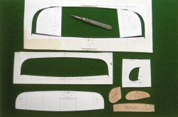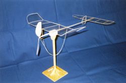 Innan du nu med en skarp skalpell skär längs vingens och stabbens ytterkontur måste du markera utanför konturen var spryglarna skall sitta. De utskurna pappbitarna från vingens båda ytterörondelar, stabben och fenan sparar du. Dessa skall användas till att böja lister runt. Lägg listerna i blöt i en halvtimme. Böj listerna runt mallarna och fäst med små bitar maskeringstejp. Låt torka över natten på ett varmt ställe. Ett litet tips: för att undvika att listbitar fastnar i de negativa formarna när du bygger kan du gnida kanten på den negativa formen med ett stearinljus. Då biter inte limmet på kartongen. Annars är det bara att följa instruktionerna som står på ritningen. KlädselKlä din modell med mylarfilm som är 0,9 mikrometer (my) tjock eller tunnare. En detaljerad beskrivning hur man gör finns i artikeln om Lättflygar'n. Observera att man klär vingen innan man bockar upp V-formen. PropellerBladen görs av 0,25 mm tjock C-grain balsa. C-grain har ett "marmorerat" eller "fläckigt" utseende på ytan. Du kan köpa balsa färdigsågad till 0,25 mm tjocklek, eller slipa ner 0,5 - 1,0 mm tjock balsa. Oavsett om du slipar eget eller köper färdigsågat söker du balsa som väger ungefär 65 kg per kubikmeter.