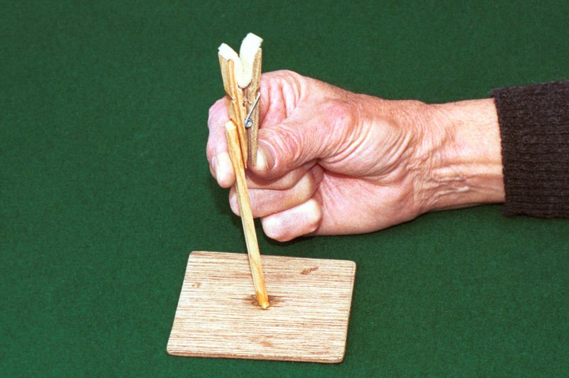 Ställ den i stället, i ställetFör att minska risken att skada sin modell så kan man tillverka ett litet ställ bestående av en bottenplatta av plywood, en bit list och en tvättklämma. Se till att klämman inte är för hård. Mjuka upp själva fjädern och limma på en bit skumplast. Se bild. (Vi har sammanställt en liten sats med kalibreringsvikter för den som vill tillverka sin egen våg. Ring till Kalle Westerblad, 040-47 20 20.) Lycka till med byggandet och flygningen! Kalle Westerblad |