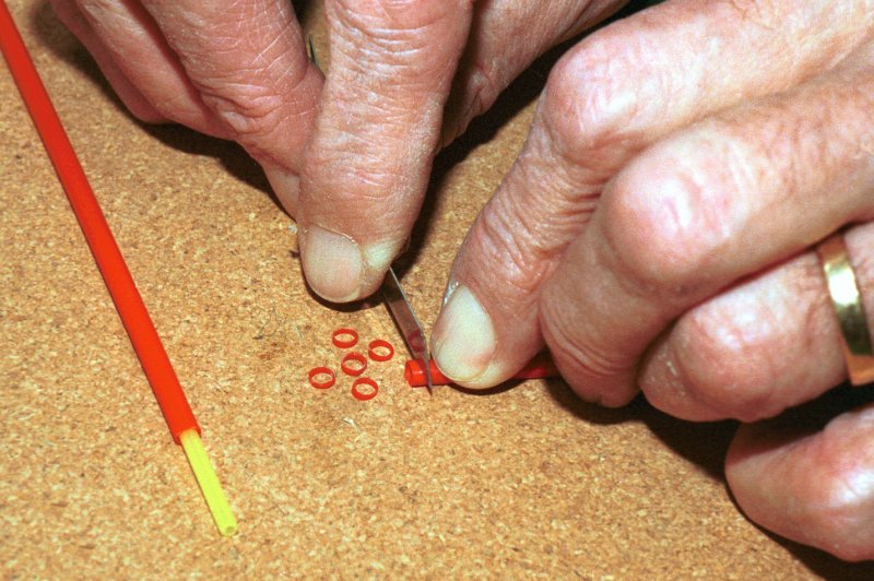 Ett annat litet tips är att du kan tillverka små ringar att trä på din gummimotor av Sullivans Golden Rods yttre rör. Tag kontakt med en radioflygare, det kan mycket väl hända att han har en liten stump i sina gömmor. Se bild. Med en ring i var ände på gummimotorn går det mycket enklare att kroka fast en fullvevad motor på din modell. Ringar kan också tillverkas av andra plaströr från till exempel bomullstoppar, pennor eller pneumatikslang. Andra alternativ är att vika ringar av 0,3 mm pianotråd eller att använda små o-ringar av gummi. Prova dig fram till den variant som passar dig bäst.